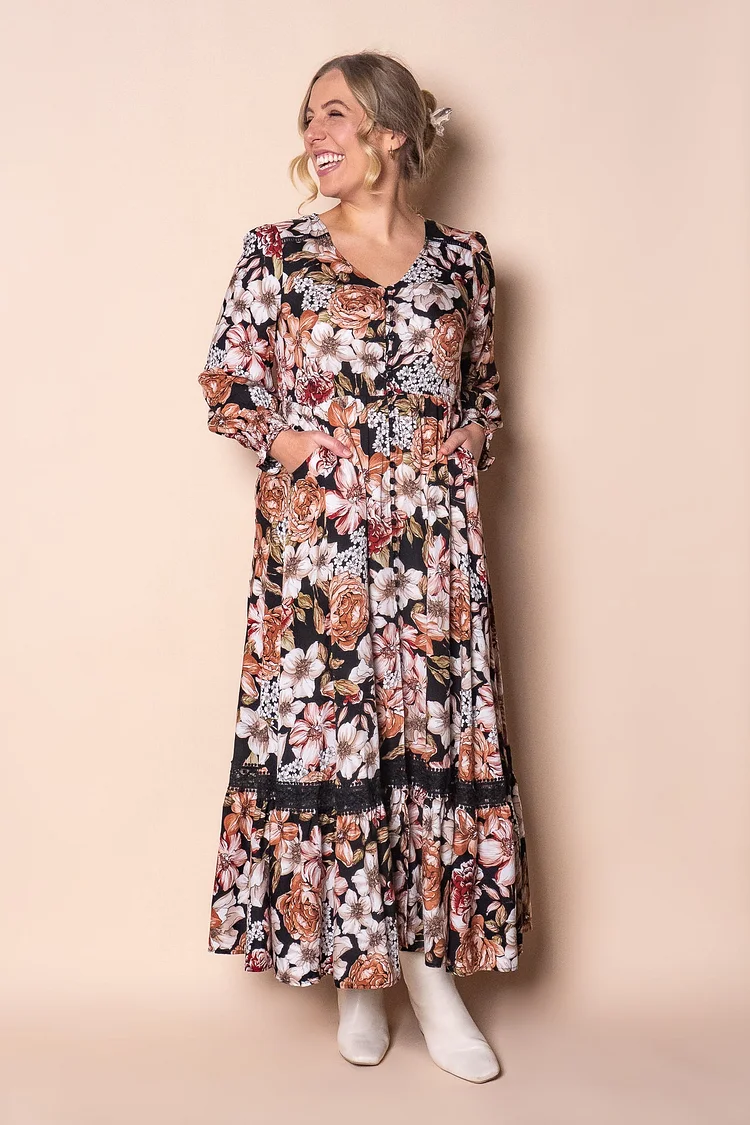 The Arabella Dress in Black Multi features a sophisticated floral print in black, white, tan, rust, and khaki tones. Crafted from 100% viscose, it offers a flattering V neckline with delicate lace trim and a functional button-down front. Long sleeves with shirred elasticated cuffs and an elasticated waistline enhance comfort and shape. Practical front hip pockets and a front skirt split add subtle elegance, while the maxi length completes the refined look. True to size, this dress combines timeless style with effortless wearability.