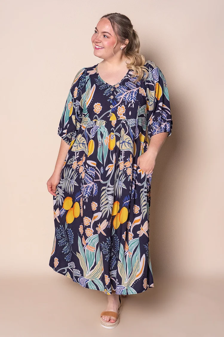 The Dora Midi Dress in Navy features a stunning floral 'Garden' print on soft 100% viscose fabric, offering both comfort and elegance. Its V neckline and faux button detailing at the bust create a refined silhouette, while 3/4 length sleeves with elasticated cuffs add subtle definition. Designed with functional side pockets and a flattering midi length, this dress provides a relaxed fit true to size. Available in plus sizes, it gracefully complements any occasion with timeless style.