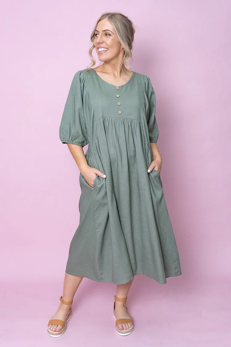 Elevate your wardrobe with the Emery Dress in Khaki. The rounded V neckline and 3/4 length sleeves with elasticated cuff exude sophistication, while the faux button detailing at the bust adds a touch of luxury. Function side pockets and a relaxed fit make this dress both practical and stylish. Made from a premium blend of viscose and linen, this midi length dress is perfect for any occasion. Consider sizing down for a slimmer fit.