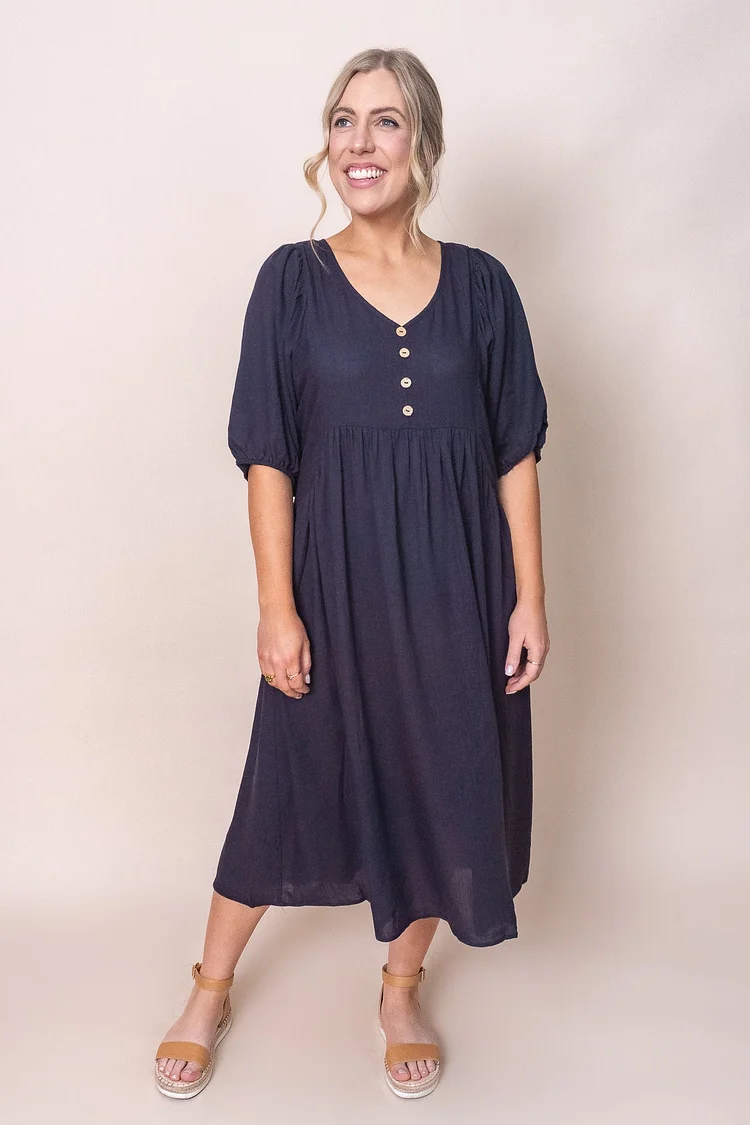 Elevate your wardrobe with the Emery Dress in Navy. The rounded V neckline and 3/4 length sleeves with elasticated cuff exude sophistication, while the faux button detailing at the bust adds a touch of luxury. Function side pockets and a relaxed fit make this dress both practical and stylish. Made from a premium blend of viscose and linen, this midi length dress is perfect for any occasion. Consider sizing down for a slimmer fit.