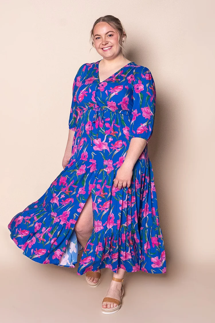 Elevate your wardrobe with the Lia Maxi Dress in royal blue, adorned with a vibrant floral print. Designed with a flattering V neckline and functional bust buttons, this dress features a drawstring waist for a tailored fit. The 3/4 sleeves with elasticated cuffs and tiered skirt with a front split offer elegance and comfort. Complete with practical side pockets, this maxi-length dress is true to size and available in plus sizes. Crafted from 100% viscose, it ensures a soft, flowing silhouette perfect for any occasion.