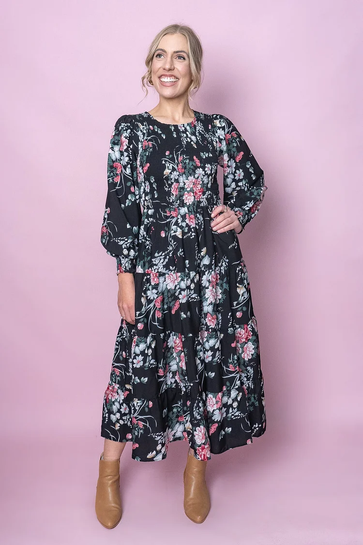 Look effortlessly chic in the Nella Dress. This black dress features a beautiful floral print, round neckline, and shirred bodice for a comfortable, flattering fit. The tiered skirt and midi length add a touch of whimsy, while the lined design ensures comfort. Made with a lightweight fabric and true to size, you'll feel as good as you look.
