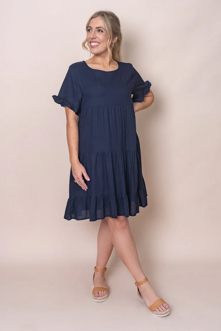 This Nicole Dress in Navy will have you feeling flirty and fun all summer long! With its ruffled sleeves and tiered skirt, this charming dress is sure to be a hit. Plus, it has all the practical details you need, such as functional pockets, a round neckline, and a knee-length silhouette. Woven from a blend of linen and viscose for a lightweight, breathable fit, it's perfect for any occasion. Available in more colours.