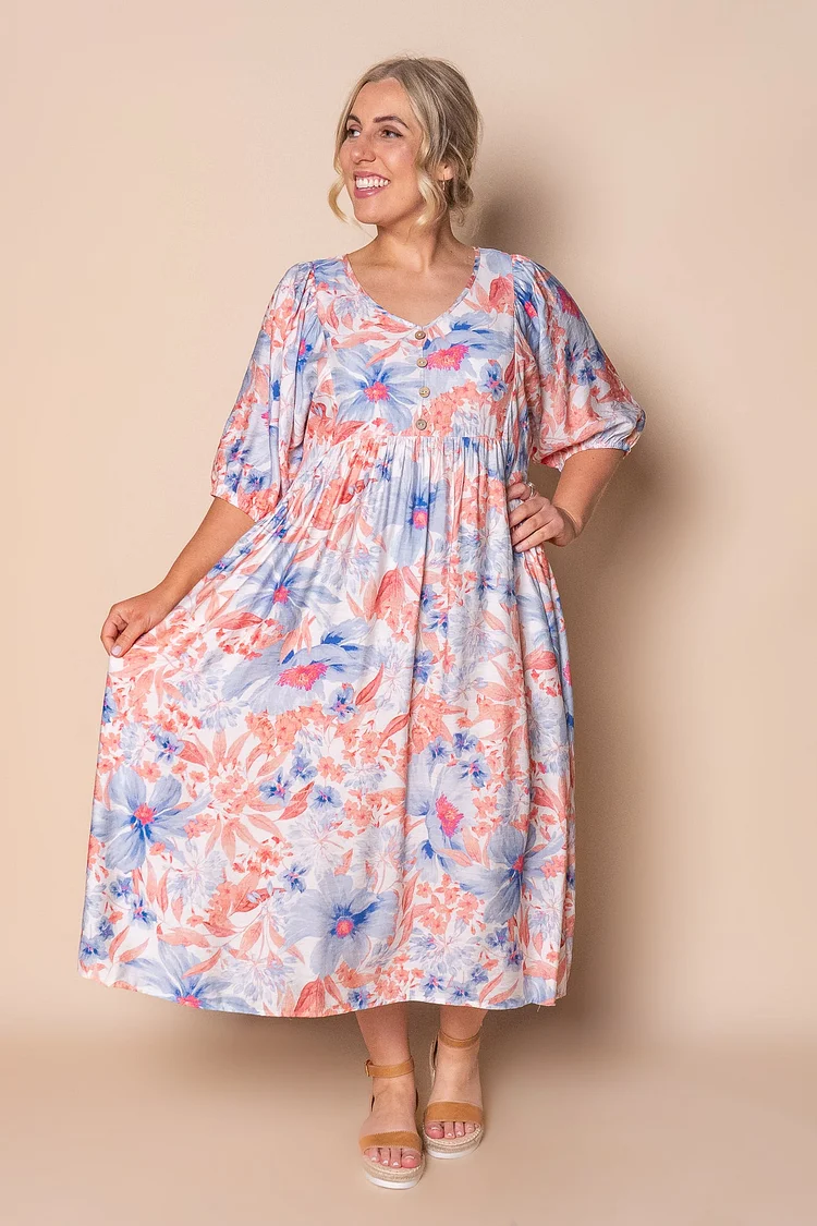 The Peaches Midi Dress in Blue Multi exudes effortless sophistication with its delicate floral print in red, white, pastel yellow, and green. Featuring a flattering V neckline and subtle faux button detailing at the bust, this dress combines elegance with comfort. The 3/4 length sleeves with elasticated cuffs complement the relaxed fit, while functional side pockets add practicality. Crafted from a soft viscose/polyester blend, its midi length and true-to-size design ensure a graceful silhouette.