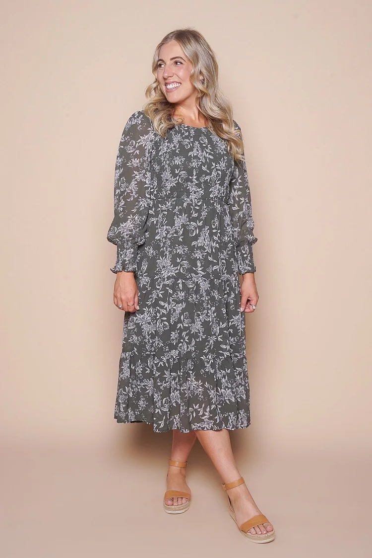 Experience the epitome of elegance in our Scout Midi Dress in Dark Olive Green. This stunning dress features a shirred, stretchy bodice and long, semi-sheer sleeves with shirred cuffs. The white floral print and tiered skirt add a touch of sophistication, while the fully lined midi length ensures a flattering fit. Crafted from luxurious polyester, this dress exudes luxury and style.