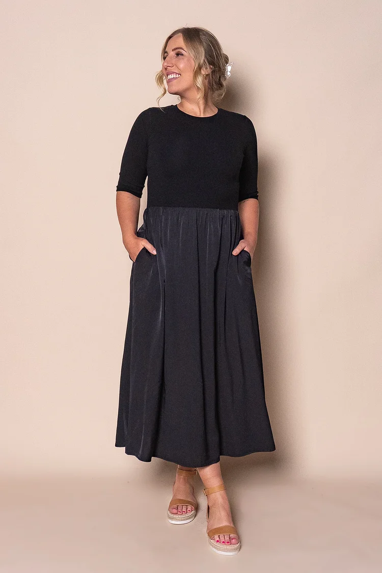 The Venetta Dress in Black boasts sophistication and luxury. Featuring a round neckline, 3/4 sleeves, and an elasticated waistline, this dress offers both style and comfort. The ribbed, stretchy bodice and satin-like skirt fabrication give the dress a high-end feel. With functional side pockets and a flowy skirt, this midi dress is both practical and elegant. Made with a blend of viscose, polyester, and cotton, the Venetta Dress is true to size and perfect for any occasion.