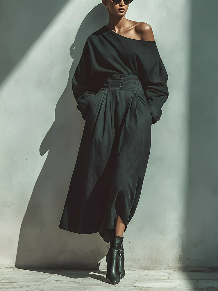 A coordinated black cotton-blend set featuring an asymmetrical off-shoulder top and a flowing high-waisted maxi skirt for a chic, modern silhouette.