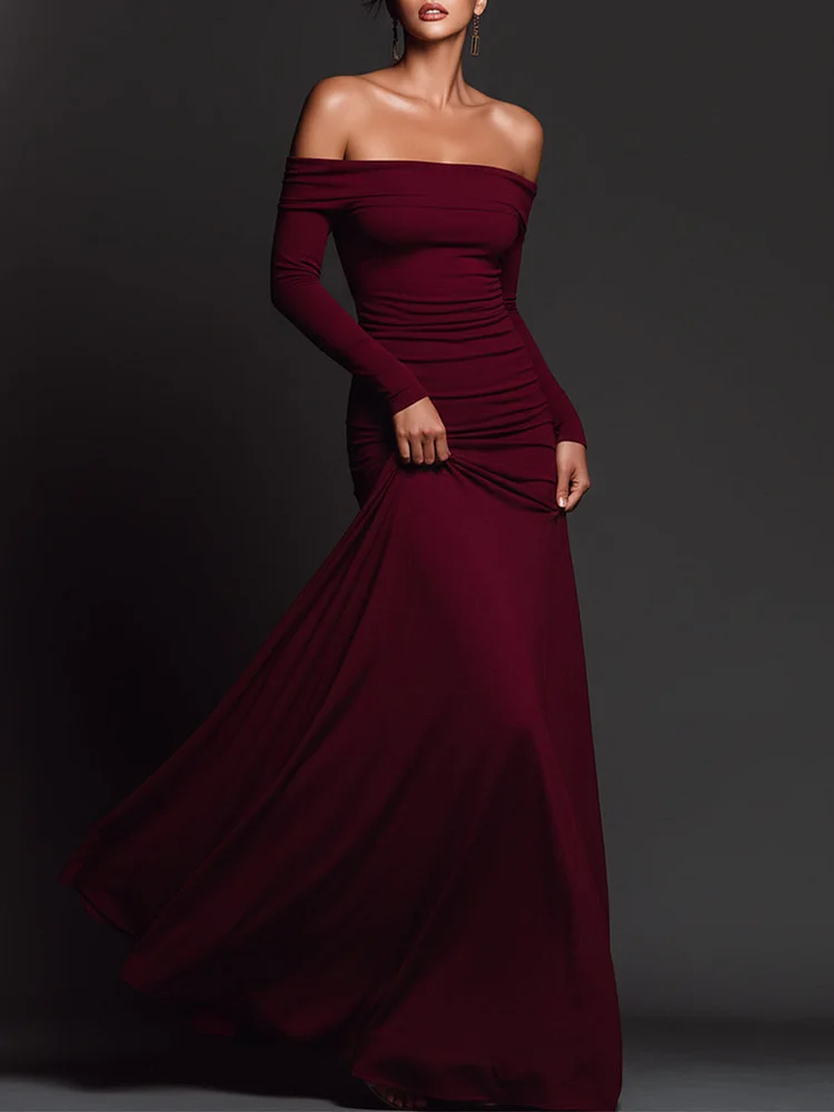 A burgundy off-shoulder maxi dress with ruching. It’s elegant, body-hugging, and perfect for formal events or stylish evenings.