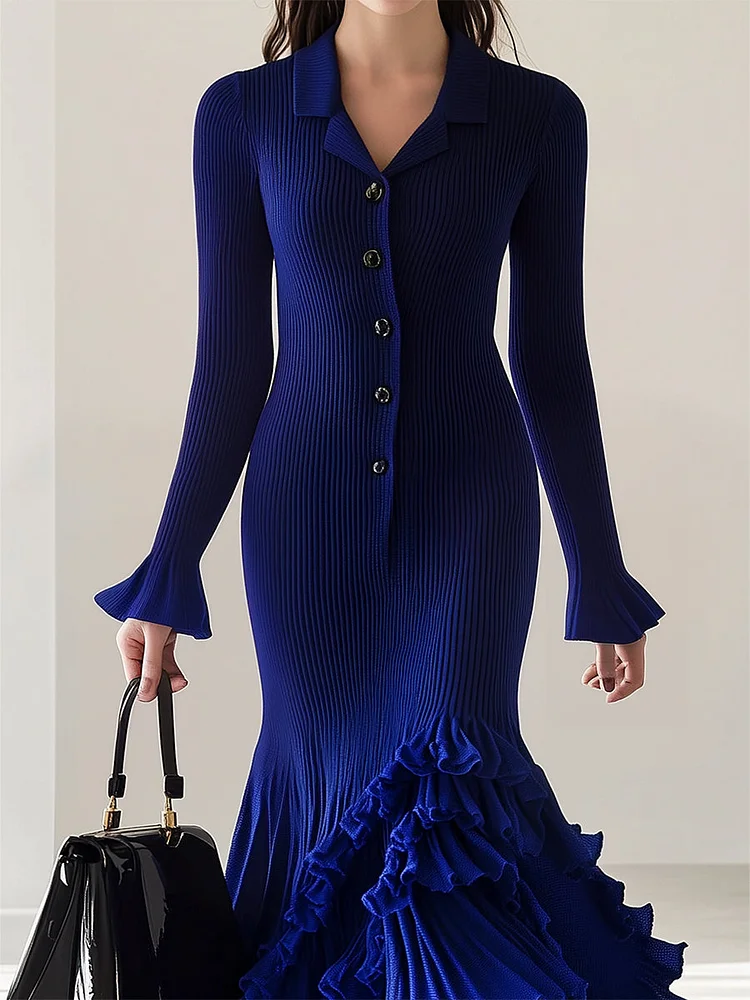 A sophisticated royal blue knitted maxi dress with a unique ruffle hem. It features a fitted silhouette and elegant design suitable for formal occasions.