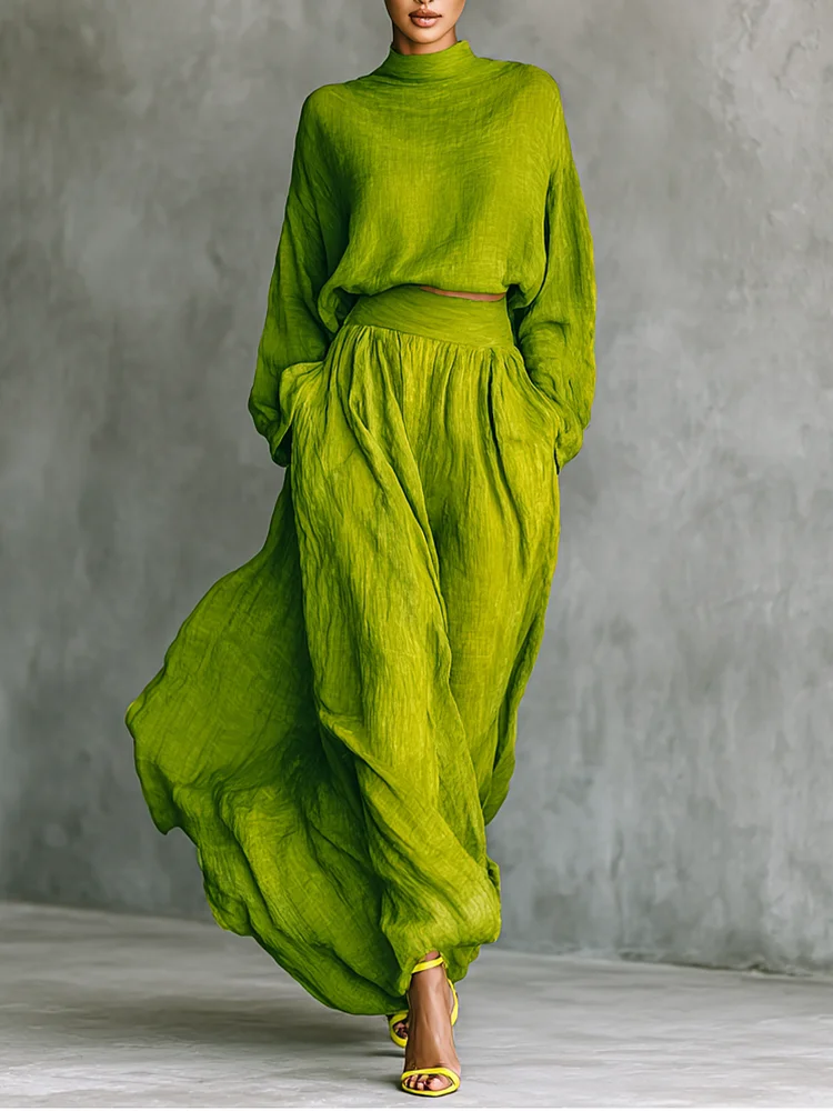This green suit set features a relaxed turtleneck top and wide-leg pants in a breathable cotton-linen blend. It offers effortless style with a flowing shape and natural texture.