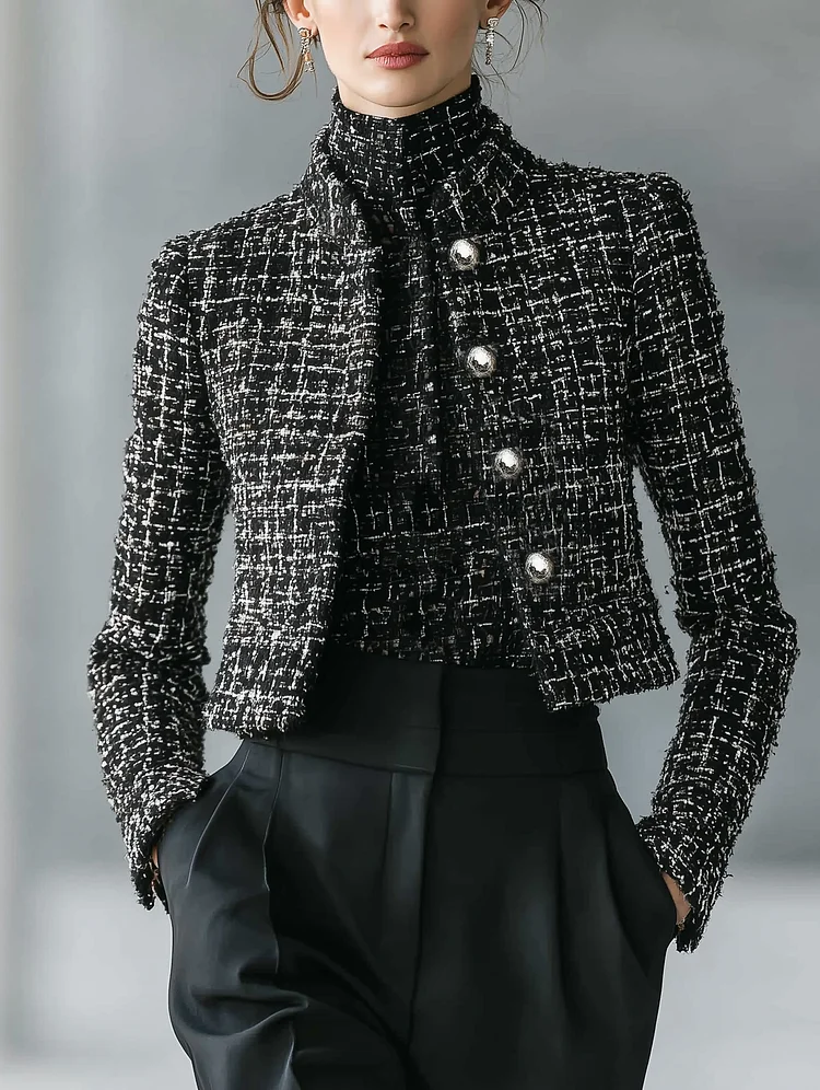 A chic tweed short jacket featuring a clean stand collar and minimalist single-breasted design for polished everyday style.