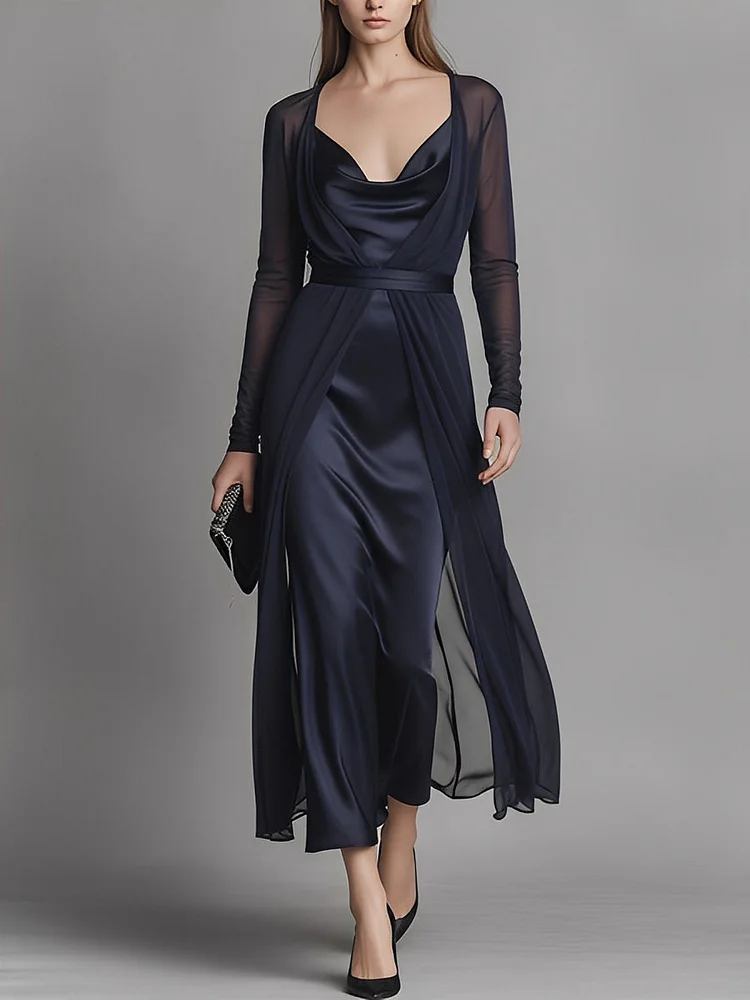 A navy satin dress with sheer draped overlay and a coordinating cardigan. It’s sophisticated, stylish, and perfect for formal events or upscale evenings.