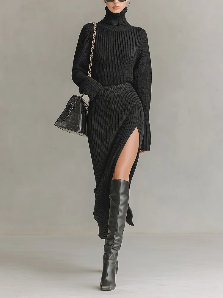 Women's Stylish And Elegant Black Slim-fit Collared Long-sleeved Knit Top Paired With A Matching Slit Skirt