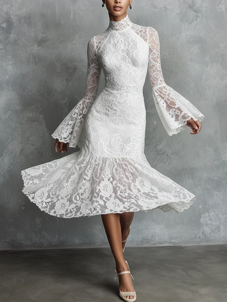 Women's White Lace Elegant Dress With Turtleneck & Bell Sleeves, Glamorous Formal Style Dress MDA2806K2I