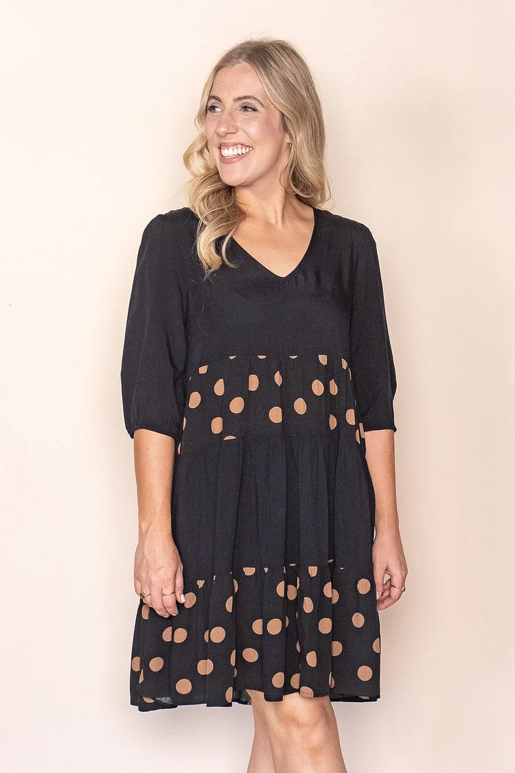 The Wynona Polka Dot Dress in Black features a sophisticated black base adorned with a contrasting tan polka dot print. Its tiered design falls gracefully to the knee, complemented by a flattering V neckline and 3/4 length sleeves with elasticated cuffs for a refined silhouette. Crafted from 100% rayon, this true-to-size dress offers comfort and fluidity, available in a range of sizes including plus. Perfect for both casual and dressier occasions, it combines elegance with effortless style.
