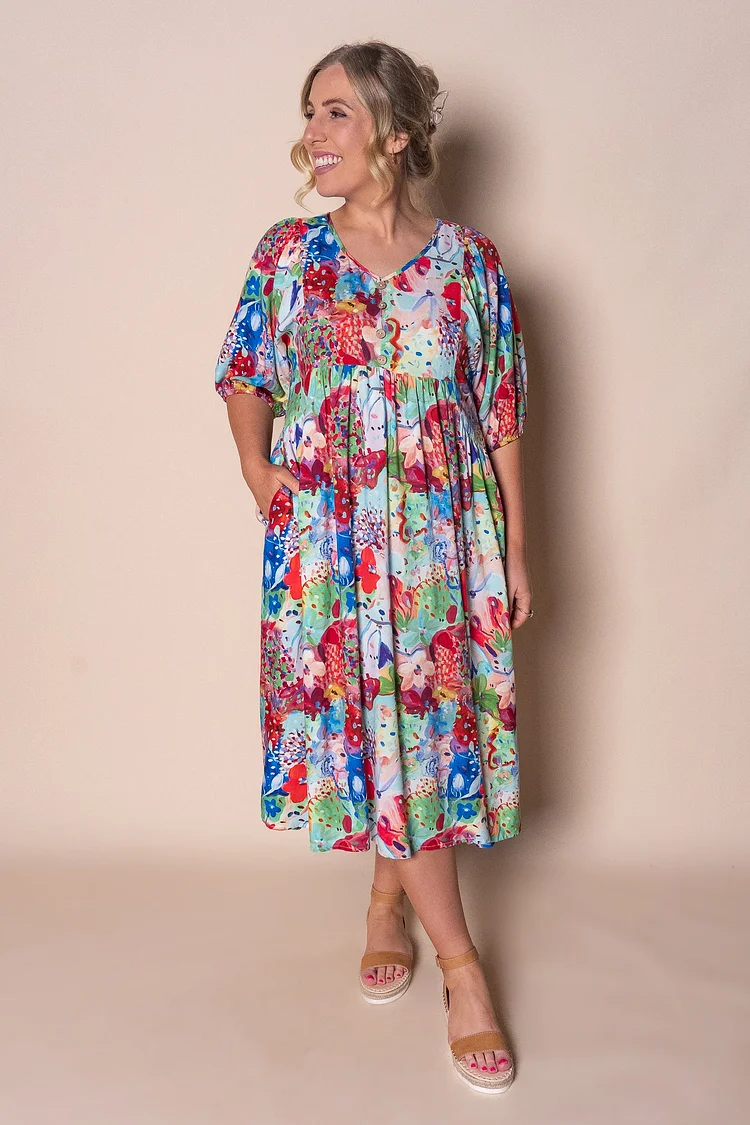 Indulge in luxury with the Zandra Midi Dress in Red Multi. The artistic floral print and faux button detailing at the bust exude elegance and sophistication. With a relaxed fit and functional side pockets, this midi dress is both stylish and practical. Made from 100% Rayon, it offers comfort and a flattering silhouette for any occasion.